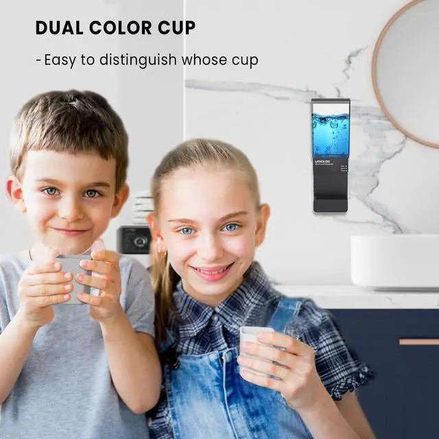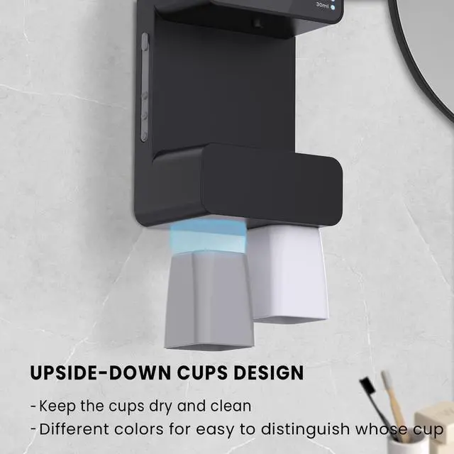 UPSIDE-DOWN MAGNETIC CUPAfter use, the magnetic cup can be be stored under the mouthwash dispenser, keep the cup dry and clean.Different colors for easy to distinguish whose cup.