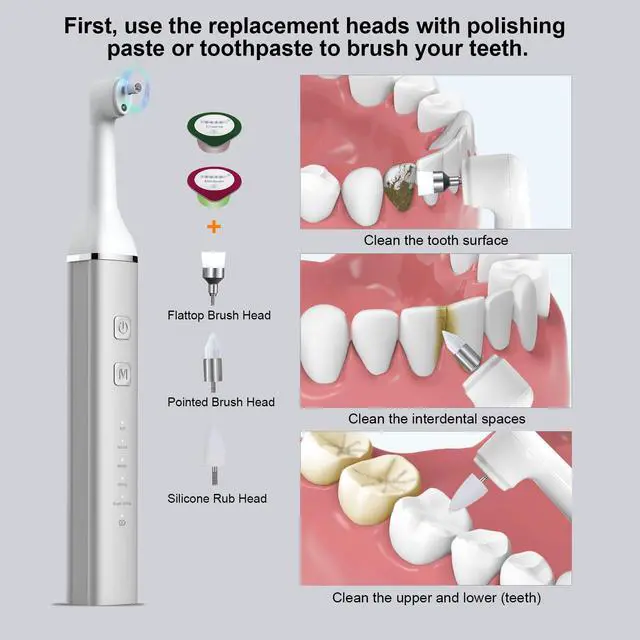 This tooth polisher set has 3 cleaning heads and 2 polishing heads. The silicone head removes tough stains, flat - top and pointed heads clean surface residue. The two polishing heads smooth teeth. With polishing paste, they help prevent cavities.