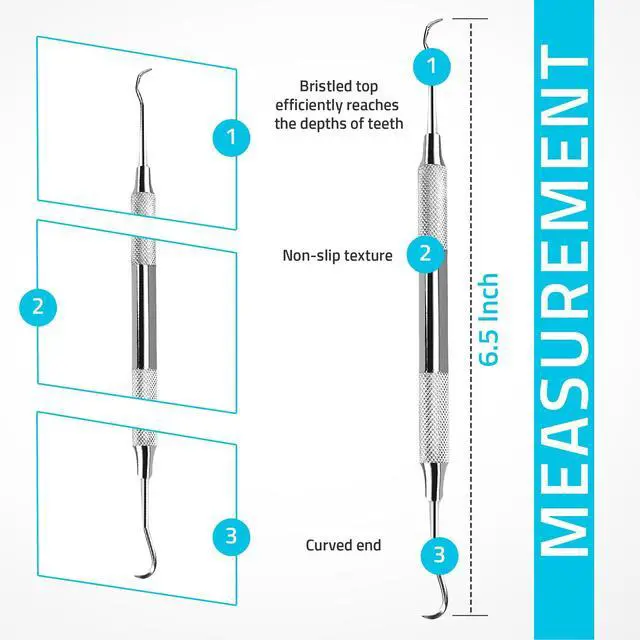 This Double-Ended Tartar Scraper Pack of 2 allows for the safe and effective removal of plaque and tartar build-up along the gum line and between the teeth without damaging the tooth enamel. The durable metal resists wear and tarnish to keep it going for longer.