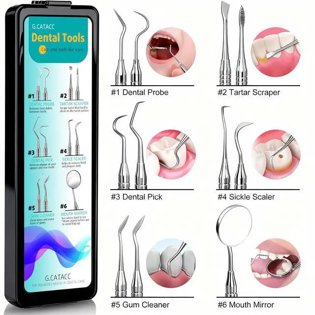 The dental pick set comes with a durable storage case with easy to follow instructions printed on the box. Compact size & travel-friendly.