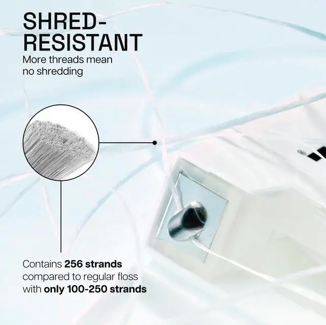 • 1.5x more threads* to resist shredding and breaking (*256-384 strans (vs. Regular Floss: 100-250))