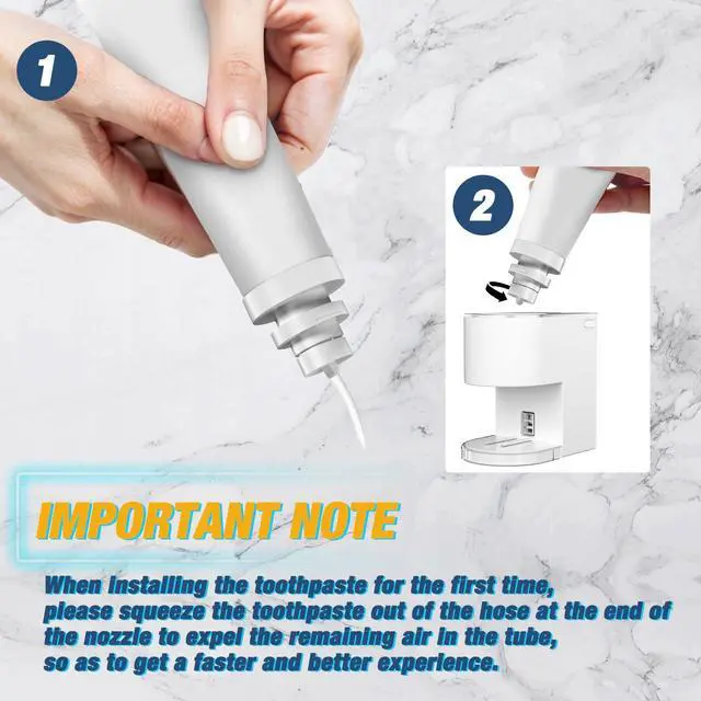 Note: When installing the toothpaste for the first time, please squeeze the toothpaste out of the hose at the bottom of the nozzle before use - in order to expel the air in the tube.