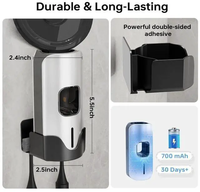 Smart Automatic Toothpaste Dispensermotion-sensor technology for touch-free operation, a long-lasting 700mAh rechargeable battery (30 days per charge), 3 adjustable dispensing modes, and an integrated toothpaste compartment - the perfect automatic toothpaste dispenser, smart toothbrush holder for modern homes.
