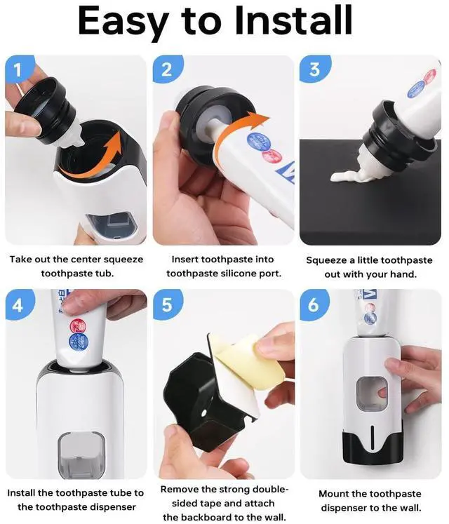 Easy Installation & Hassle-Free CleaningThis toothpaste dispenser wall mounted offers versatile placement - use it on countertops or mount it securely with the included adhesive bracket (no drilling required). The toothpaste dispenser features a detachable top and paste compartment for effortless cleaning, preventing residue buildup and tube clogs. Keep your bathroom and toothpaste squeezer hygienic with this mess-free design.