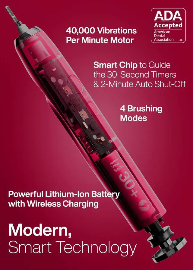 • 40,000 VPM Smart Toothbrush Beauty, brains and power. The Vibe Series is a world class modern electric toothbrush packed with the most up to date technology. It features an ultra-powerful and industry leading motor producing 40,000 vibrations per minute, lithium-ion battery, ultra-fast wireless charging, 4 mode operation, smart vibration timers, 8 DuPont engineered brush heads, and a custom travel case; all with a sleek, ultra-slim, lightweight and IPX7 rated waterproof body.