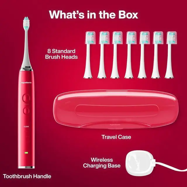 Vibe Series Ultra-Whitening Toothbrush ADA Accepted Electric Toothbrush - 8 Brush Heads & Travel Case 40,000 VPM Motor & Wireless Charging - 4 Modes w Smart Timer Ruby
