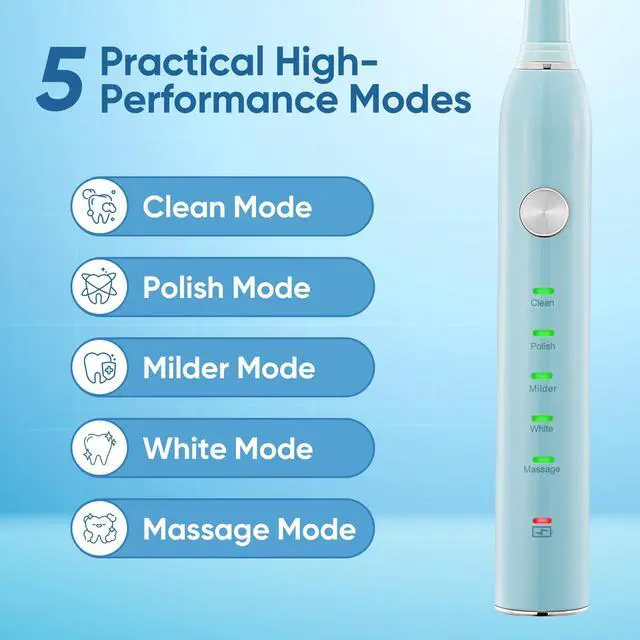 5 Practical High-Performance Modes: Features Clean (daily thorough cleaning), Polish (enhances tooth surface smoothness), Milder (gentle care for sensitive oral needs), White (daily brightening care), Massage (gum comfort & relaxation)one-key switching, meets diverse needs of adults, kids and families.