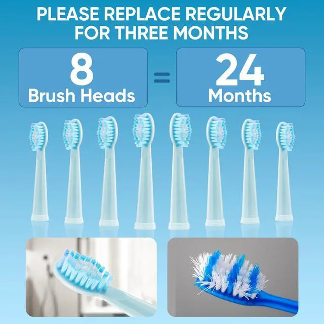 Quick Switch-Off & 24+ Months of Replacement Heads: Press and hold the switch to turn off quickly (no need to cycle through modes); comes with 8 high-quality brush heads (3-month recommended cycle) for over 2 years of use, saving time and money.