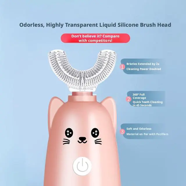 SOEWIOU kids U-shaped electric toothbrush features a food-grade soft silicone brush head that fits the entire dental arch. Fully automatic mouth-held design makes brushing easier and more fun for kids. Ultrasonic high-frequency vibration deeply cleans teeth and gums, 360° all-round cleaning. Compact and portable, IPX7 waterproof, rechargeable, perfect for home and travel use.