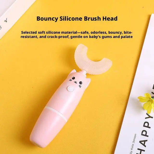 SOEWIOU kids U-shaped electric toothbrush uses a full-coverage mouth-held design for easy and fun brushing. With automatic high-frequency cleaning, it gently removes food residue and plaque from all tooth surfaces. Soft food-grade silicone brush head, IPX7 waterproof, USB rechargeable, compact and portable for home, school and travel use.