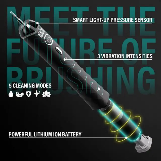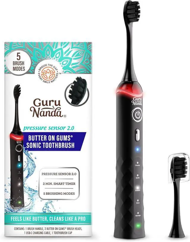 Pressure Sonic 2.0 Electric Toothbrush with Butter On Gums Bristles Smart Pressure Sensor, 5 Modes, 2-Min Timer, 55-Day Rechargeable Battery, IPX7 Waterproof, Black