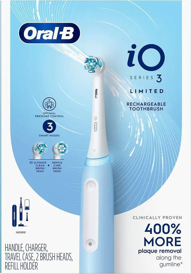 iO Deep Clean Rechargeable Electric Toothbrush, Black, iO Series 3 Limited, 2 Brush Heads, Travel Case, Pressure Sensor, 3 Cleaning Settings Icy Blue