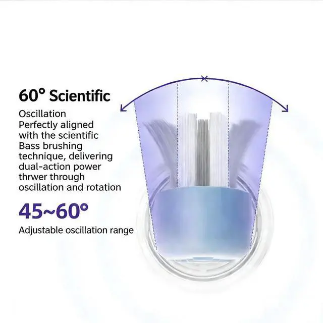 • Scientific Oscillation 60° adjustable oscillation range (4560°) with a dualaction motor combining oscillation and rotation, perfectly aligned with the Bass brushing technique for effective plaque removal.