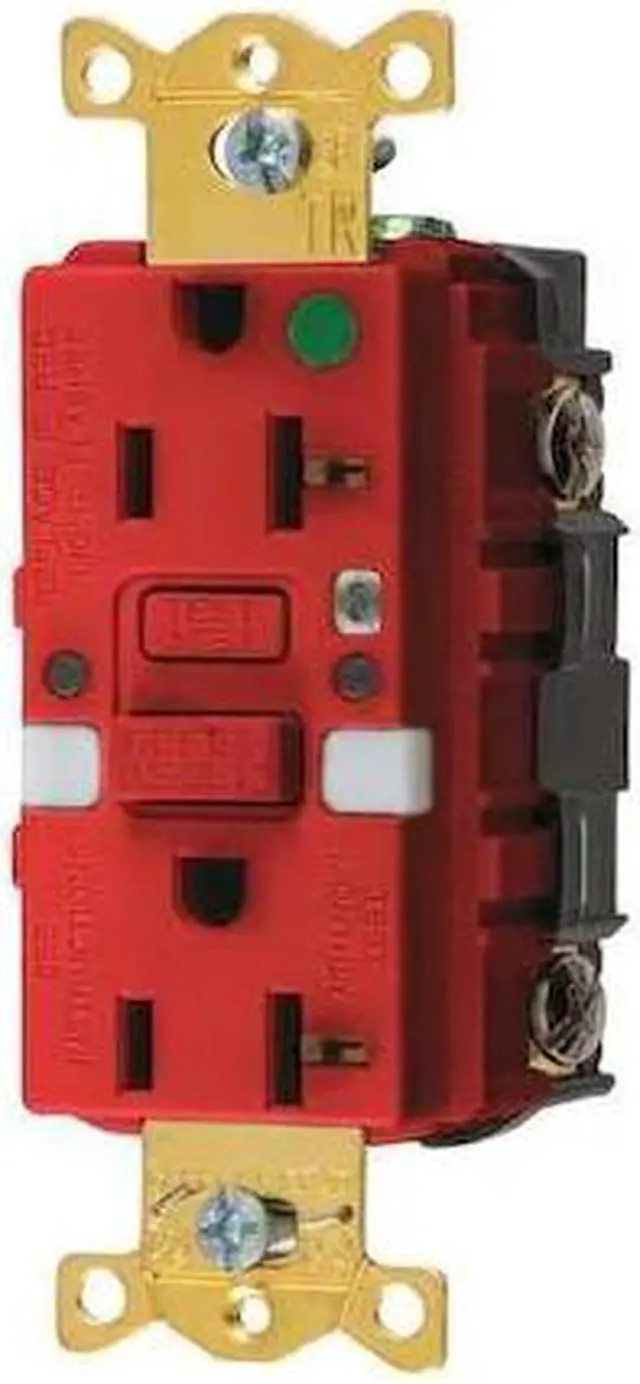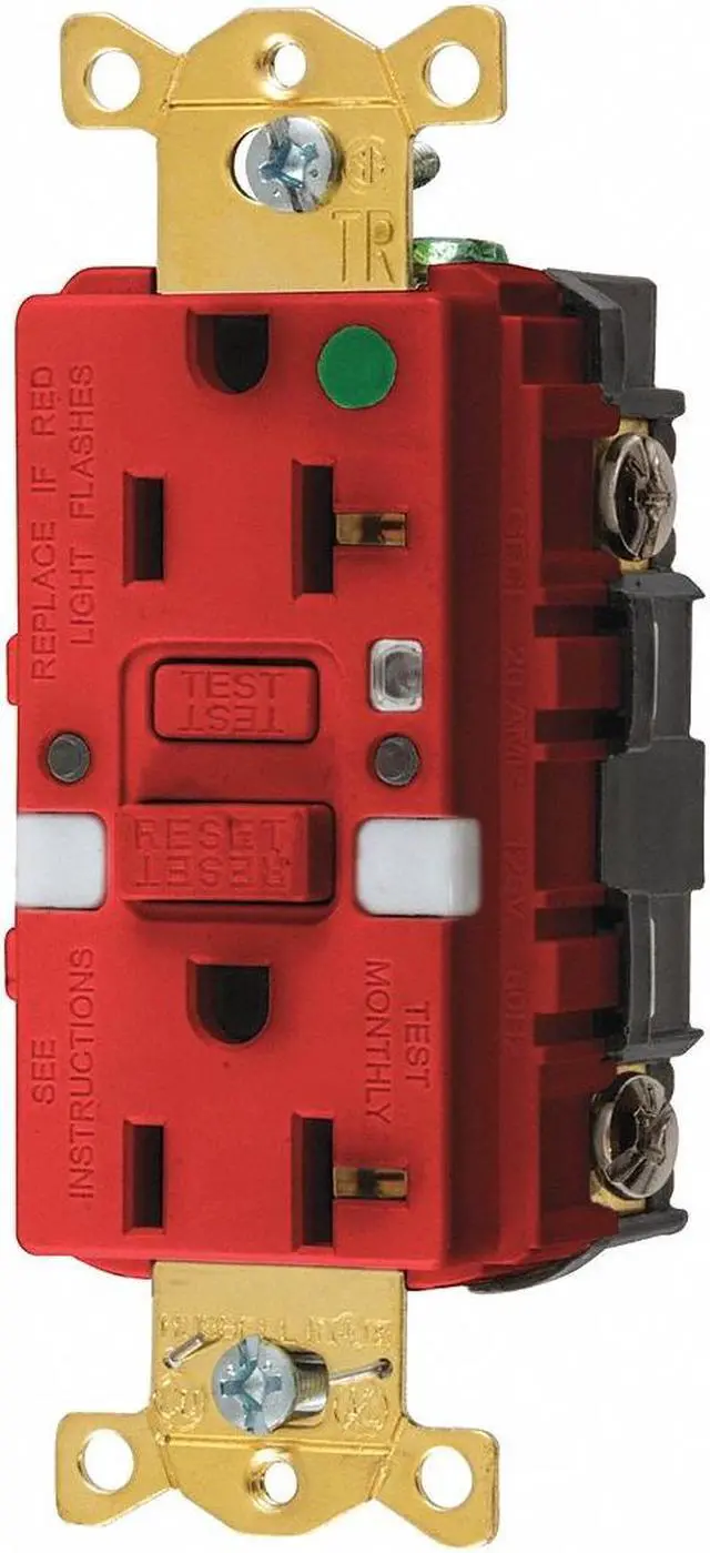 This hospital grade receptacle is designed to withstand the severe conditions of abuse that are unique to hospital environments. Built with nickel-plated bypass contacts that increase contact pressure and help lower operating temperature. The four-point grounding system provides redundant grounding for low resistance ground continuity, and thermoplastic polyester (RTP) back is tough and heat-resistant. To quality for the hospital grade designation and use of the green dot symbol, UL requires product performance to specific levels. These levels form an established baseline below which no manufacturer can fall and still carry a green dot. GFCI Rceptcle, Hspital, Red, 20A, 1 HP