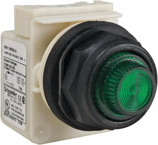 Pilot Light, Voltage 120V AC, Color Green, Lamp Type LED, Shape Round, Terminal Connection Screw Clamp, Lens Material Polycarbonate, 30 mm, Lamp Module Type Full Voltage, Basic Material Plastic, Lens Type Fresnel, Lamp Voltage 120V AC, Replacement Lamps N/A, Body Material Plastic, NEMA Rating 1, 12, 13, 2, 3, 3R, 4, 4X, 6, IP Rating IP66, Standards REACH, RoHS, WEEE. This item has been restricted from sale in the following state (s): []