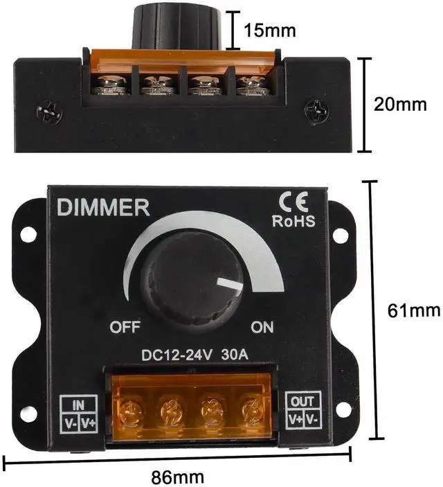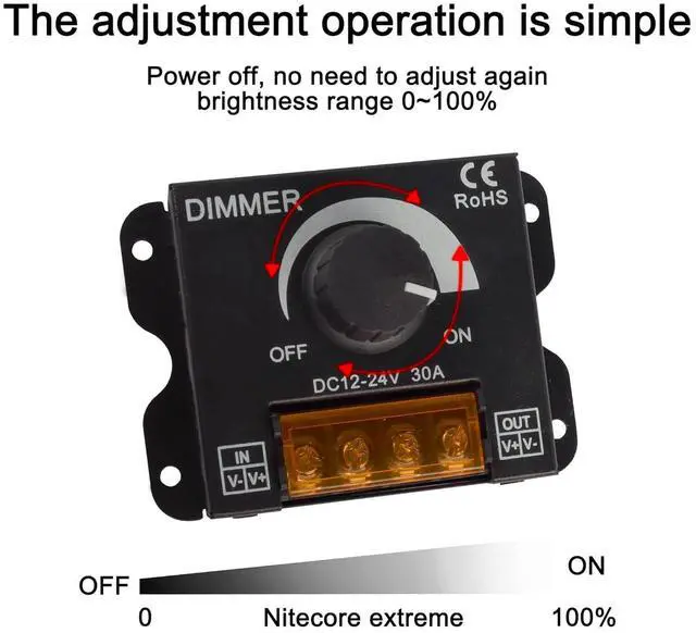 DC 12V-24V LED light single channel dimming controller maximum output 30A, suitable for monochrome LED strip light is mainly used to adjust single color LED lights/lights, such as LED lights, LED modules, RV, deck lights, garden lights etc.