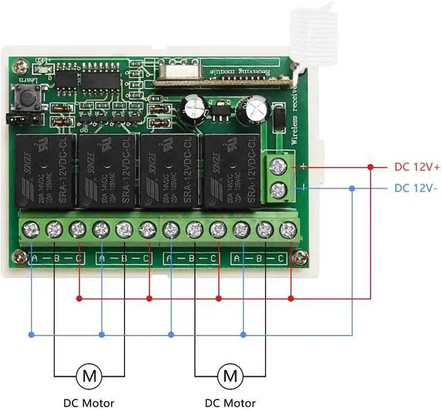 To control motors forwarding and reversing with this wilress remote control switch, we need to have two relays works as a group, one relay for forwarding and one relay for reversing.