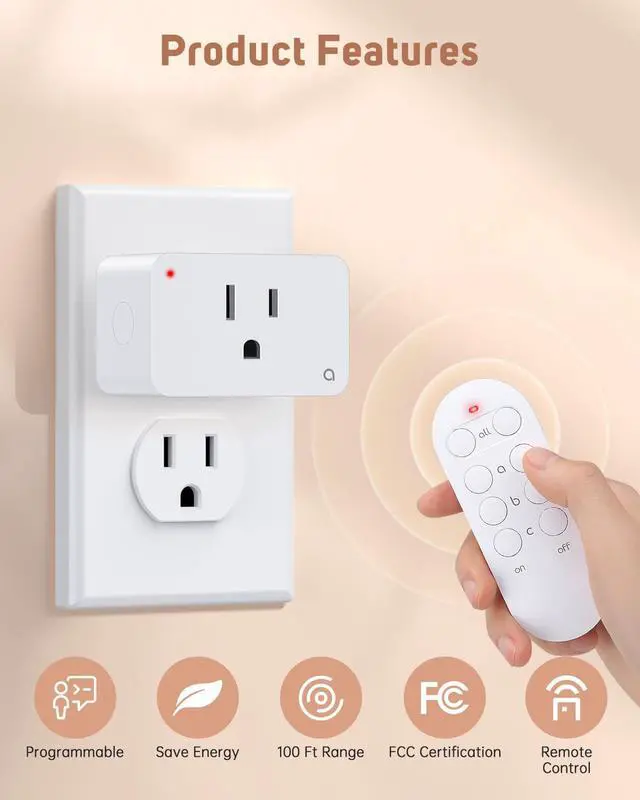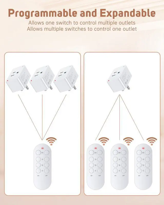 This remote control outlet has a compact design, occupies only one wall socket, does not interfere with the normal use of other plugs, to meet your needs for the use of multiple sockets, while the power is automatically turned off after the power failure, effective energy saving