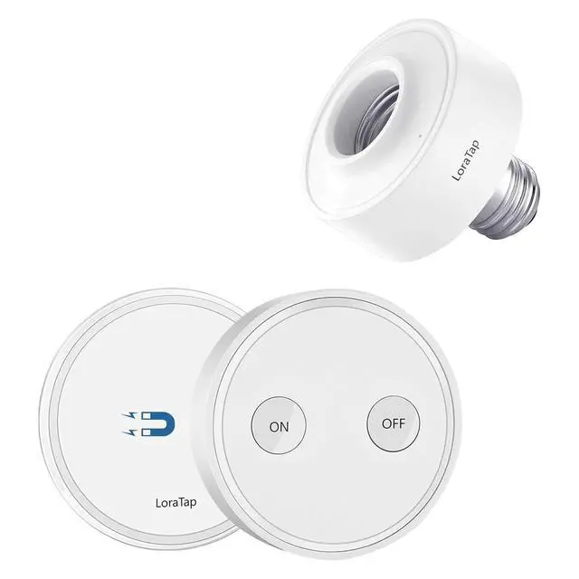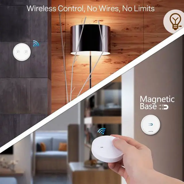 The remote control comes with a magnetic base that conveniently adheres to any metal surface, such as a refrigerator door or metal furniture. Additionally, it includes double-sided adhesive tape, allowing it to be securely mounted on any flat wall surface. This enables you to remotely turn connected lights on or off without ever having to leave your sofa or bed.