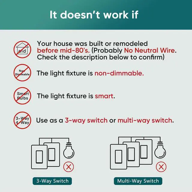 This switch requires a neutral wire to work. Homes built before the mid-1980s may not have a neutral wire, so please confirm the wiring before installation. The switch will not power on if the neutral wire is missing or incorrectly connected.