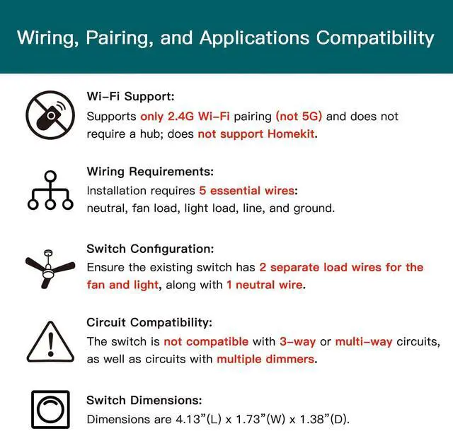 Supports AC motor ceiling fans with 4 speeds and a max load of 1.5A. Not compatible with remote-controlled fans, smart fans, DC motor fans, or exhaust fans. Canopy modules must be removed.