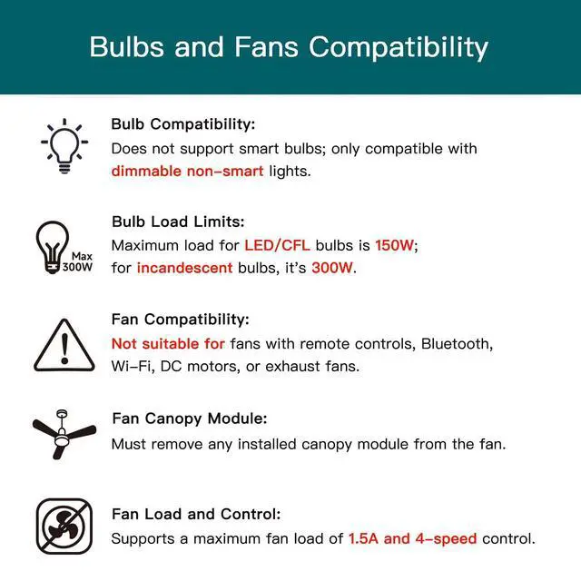 Works with dimmable, non-smart bulbs only. Supports up to 150W LED/CFL or 300W incandescent. Smart bulbs, non-dimmable bulbs, or fixtures with built-in controls are not supported.