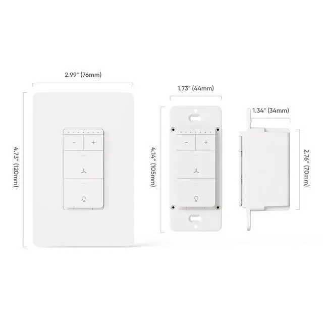 The switch measures 4.14 × 1.73 × 1.34 inches. It fits standard wall boxes, but please allow enough space for wiring before installation.