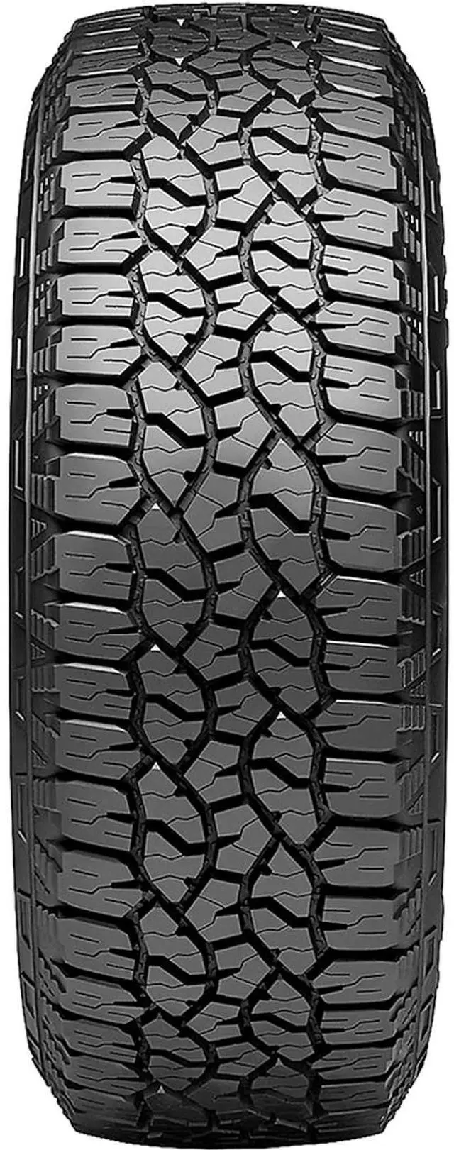 The siping detail increases the all weather traction and the stepped shoulder design and sawtooth tread blocks clean the footprint by dispersing mud and snow from it. The computer optimized tread design cancels out the road noise generated. It also prevents irregular wear across the Wrangler TrailRunner AT's tread area, making the tread last for a longer period of time.