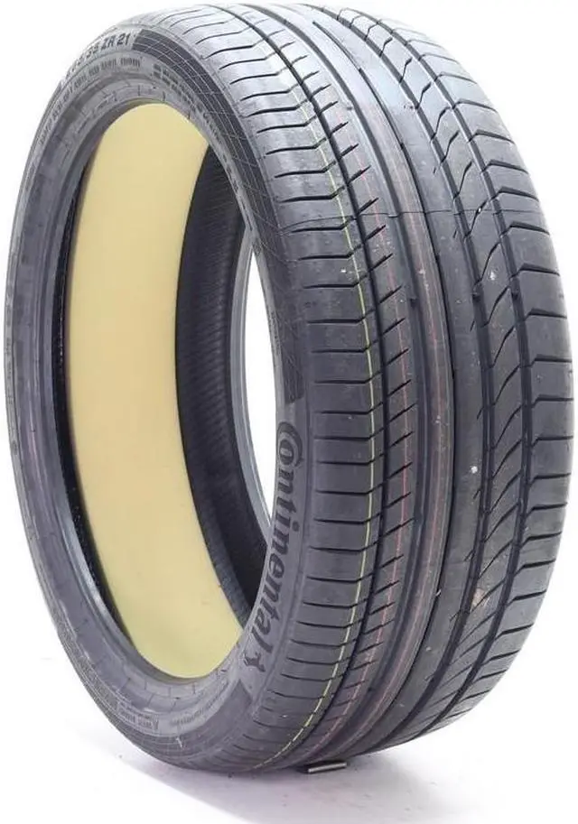 The Continental ContiSportContact 5P ContiSilent (T0) is a high performance, summer tire manufactured for passenger vehicles and SUVs. It is the original equipment tire of select Tesla vehicles. This tire is for the rear axle position. The ContiSilent Technology's special polyurethane foam on the tread inner lining absorbs the road noise and offers a quiet drive. This model has outstanding summer traction. The tire's tread grooves help avoid hydroplaning. This model's cornering ability and braking distance were improved by the Black Chili compound and the additional biting edges on the tread. The ContiSportContact 5P ContiSilent (T0) has also improved its steering precision.