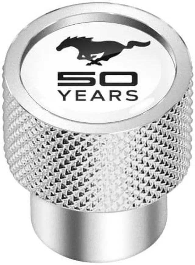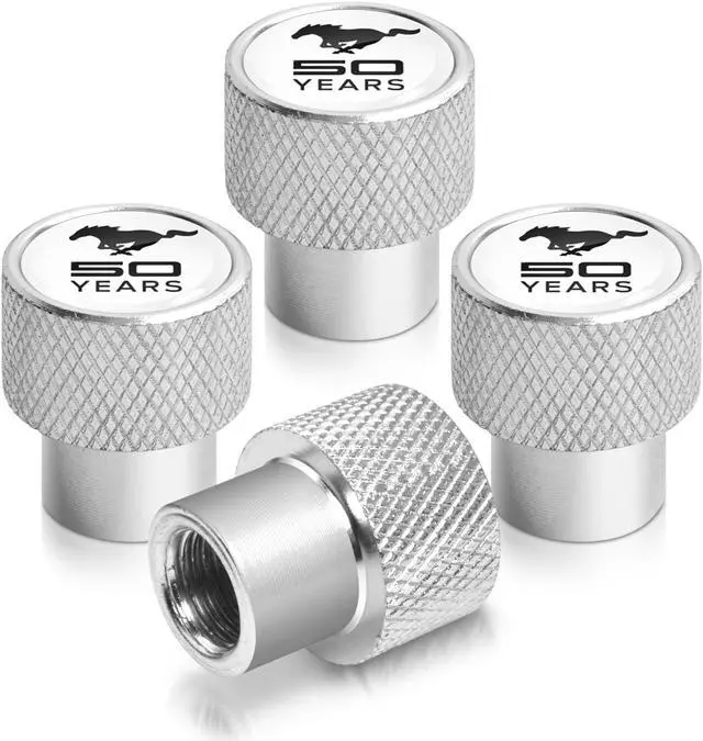 Ford Mustang 50 Years in White on Silver Chrome Aluminum Tire Valve Stem Caps