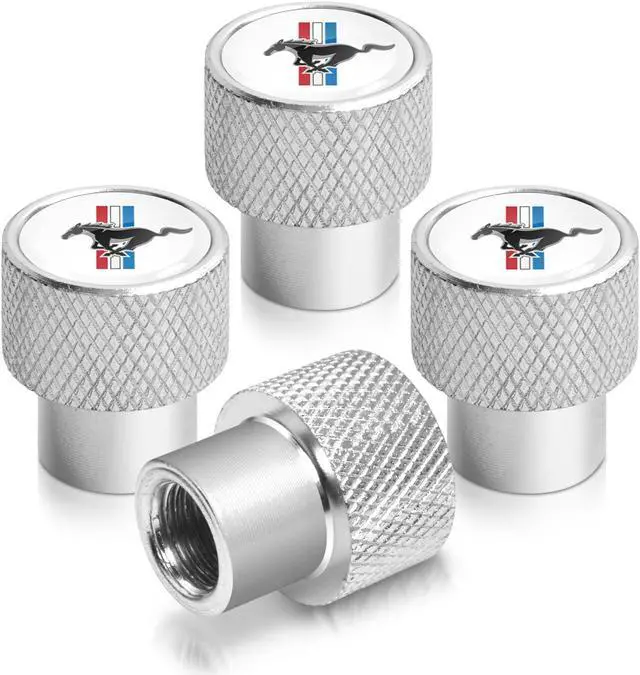 Ford Mustang Tri-Bar in White on Silver Chrome Aluminum Tire Valve Stem Caps