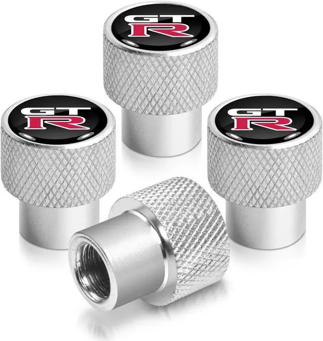 Nissan GT-R in Black on Shining Silver Aluminum Tire Valve Stem Caps