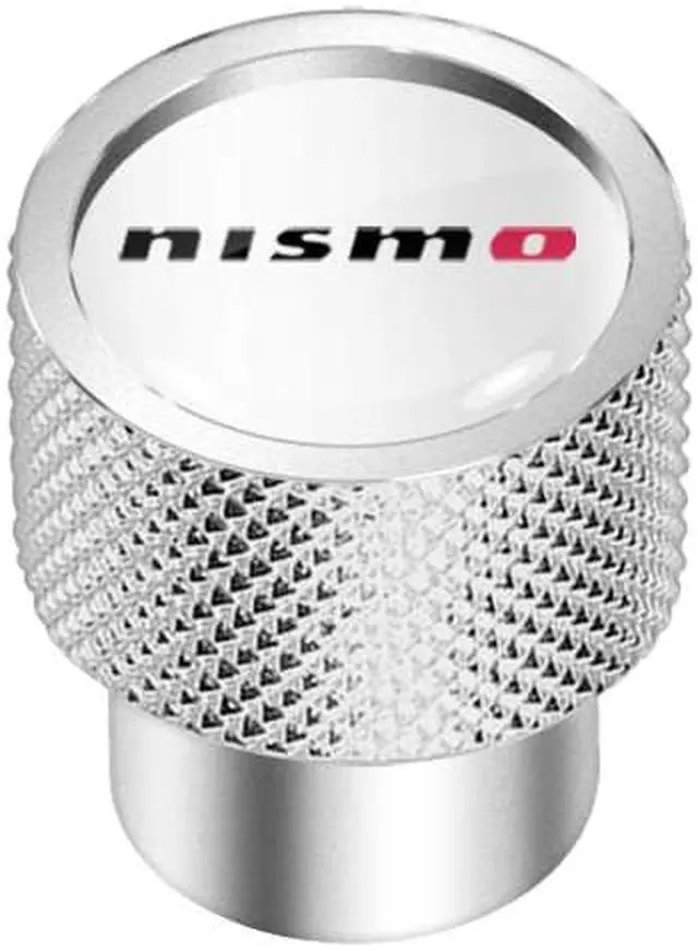 Nissan NISMO in White on Shining Silver Aluminum Tire Valve Stem Caps