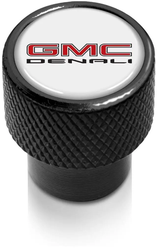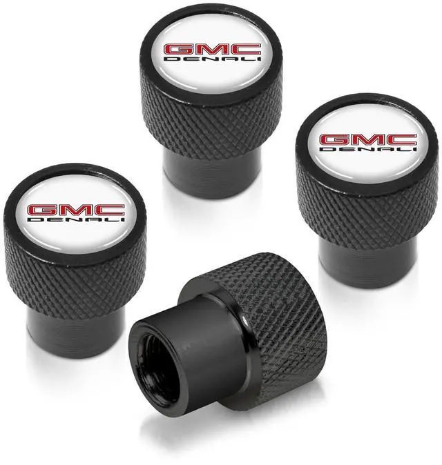 GMC Denali Nameplate in White on Black Aluminum Tire Valve Stem Caps