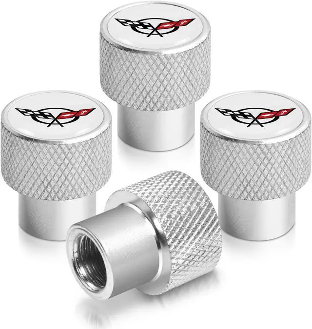 Chevrolet Corvette C5 Logo White on Shining Silver Aluminum Tire Valve Stem Caps