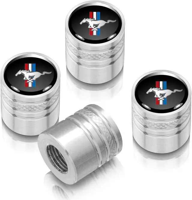 Ford Mustang Tri-Bar Black on Silver Aluminum Cylinder-Style Tire Valve Stem Caps