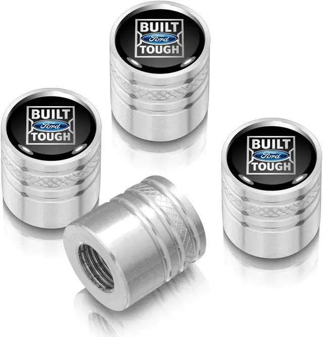 Ford Built-Ford-Tough Black on Silver Aluminum Cylinder-Style Tire Valve Stem Caps