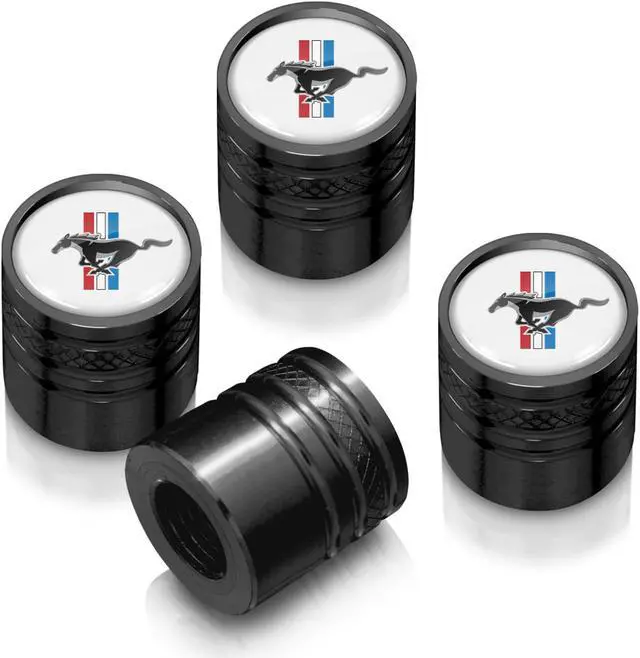 Ford Mustang Tri-Bar White on Black Aluminum Cylinder-Style Tire Valve Stem Caps