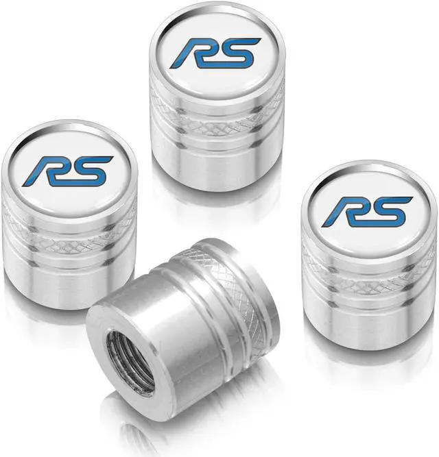 Ford Focus RS White on Silver Aluminum Cylinder-Style Tire Valve Stem Caps
