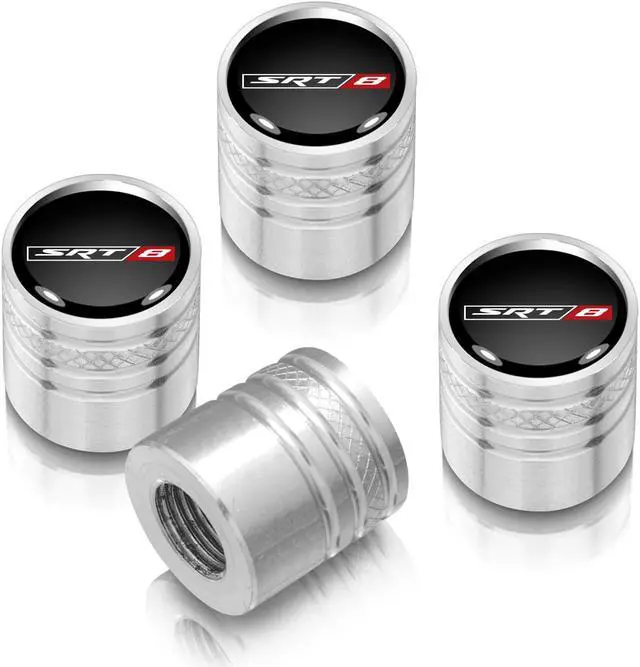 Dodge Jeep SRT-8 Black on Silver Aluminum Cylinder-Style Tire Valve Stem Caps