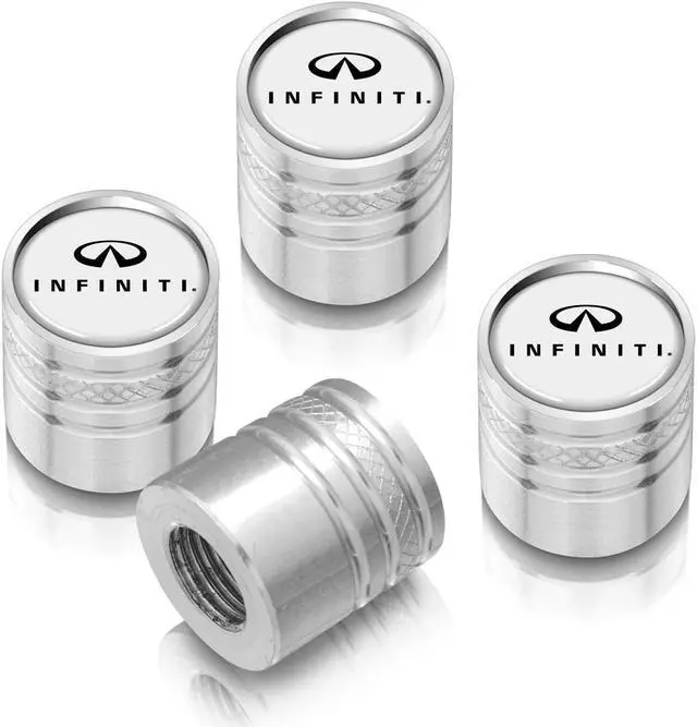 INFINITI Logo White on Silver Aluminum Cylinder-Style Tire Valve Stem Caps