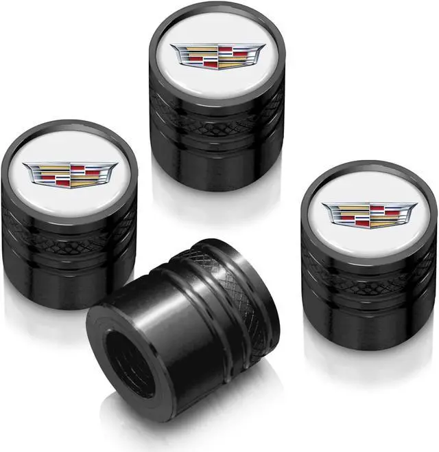 Cadillac Crest Logo in White on Black Aluminum Cylinder-Style Tire Valve Stem Caps