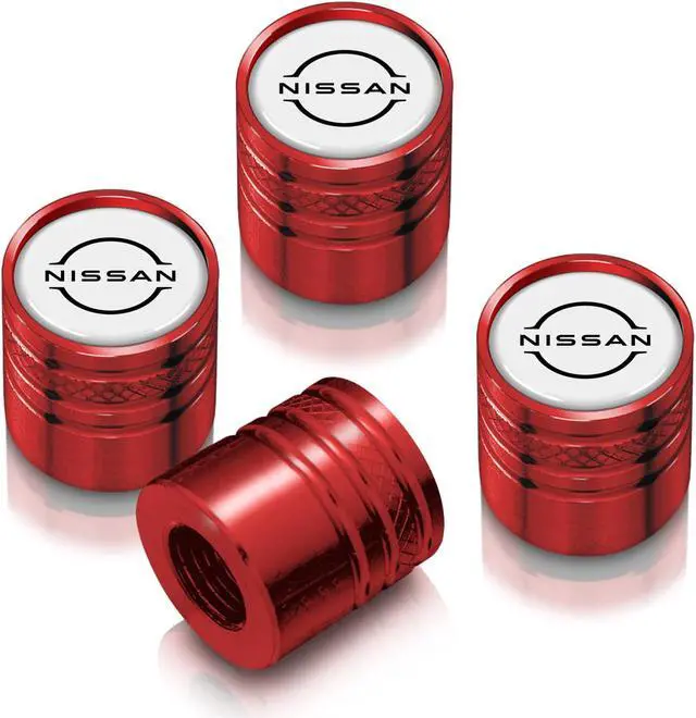 Nissan New Logo in White on Red Aluminum Cylinder-Style Tire Valve Stem Caps