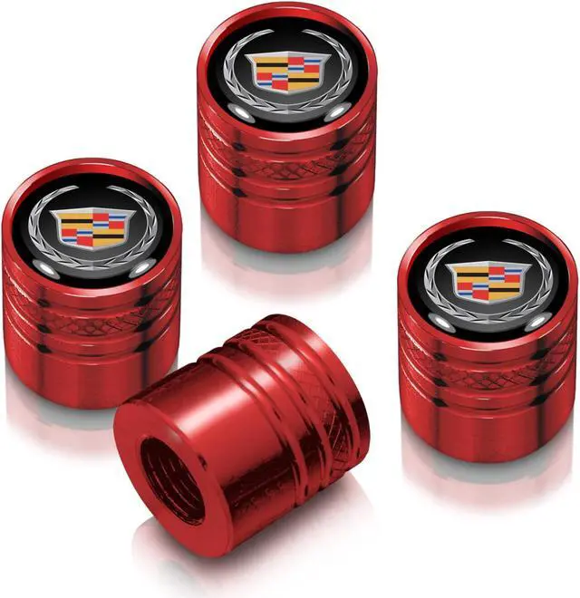 Cadillac Logo in Black on Red Aluminum Cylinder-Style Tire Valve Stem Caps