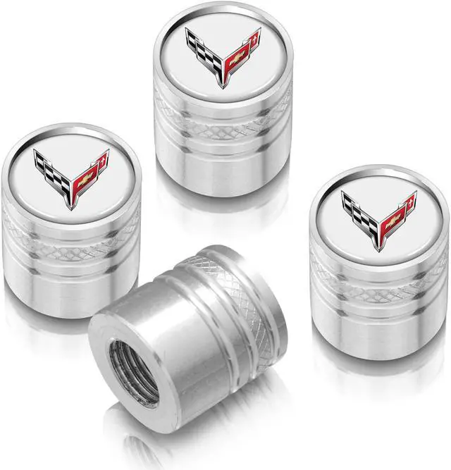 Chevrolet Corvette C8 Logo in White on Shining Silver Aluminum Cylinder-Style Tire Valve Stem Caps