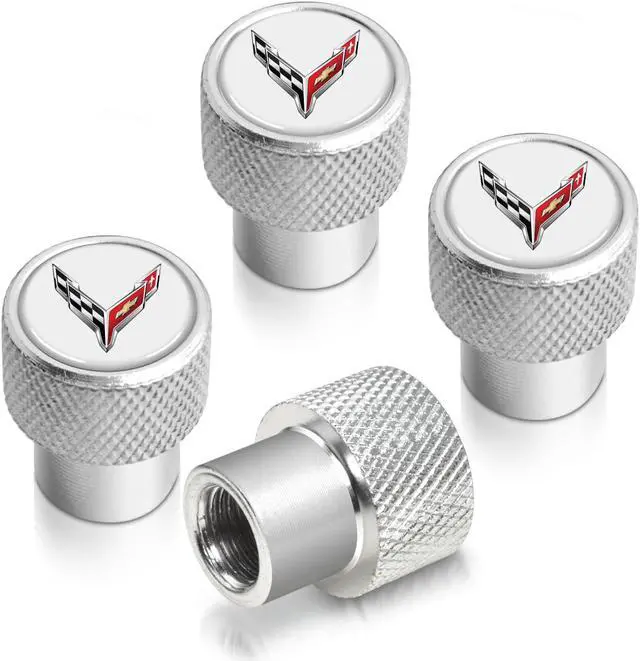 Chevrolet Corvette C8 Logo in White on Shining Silver Aluminum Tire Valve Stem Caps