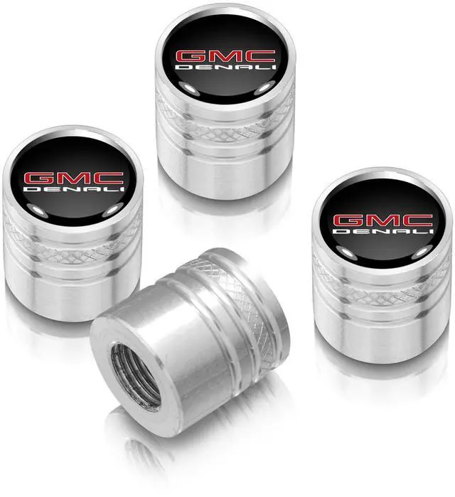 GMC Denali Nameplate in Black on Shining Silver Aluminum Cylinder-Style Tire Valve Stem Caps