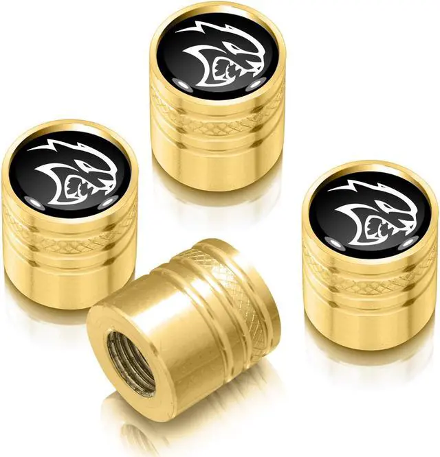 Dodge SRT Hellcat in Black on Golden Aluminum Cylinder-Style Tire Valve Stem Caps