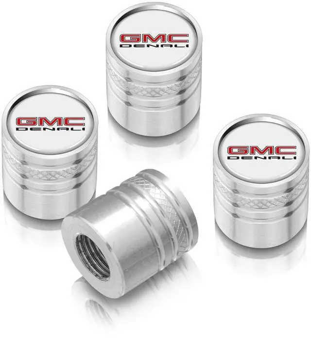 GMC Denali Nameplate in White on Shining Silver Aluminum Cylinder-Style Tire Valve Stem Caps