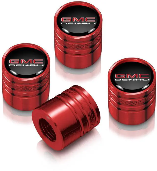 GMC Denali Nameplate in Black on Red Aluminum Cylinder-Style Tire Valve Stem Caps